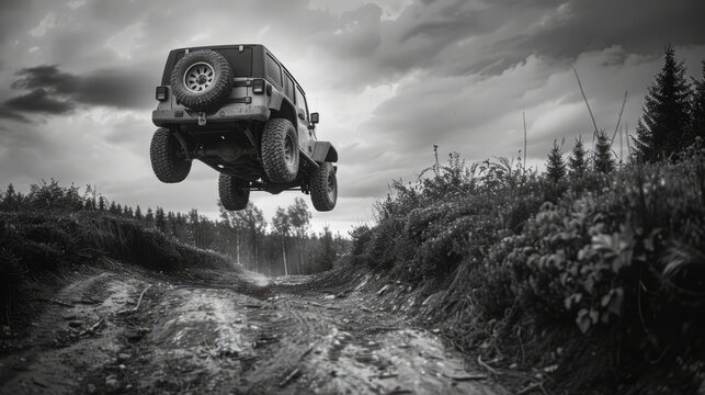 A jeep is flying through the air over a dirt road