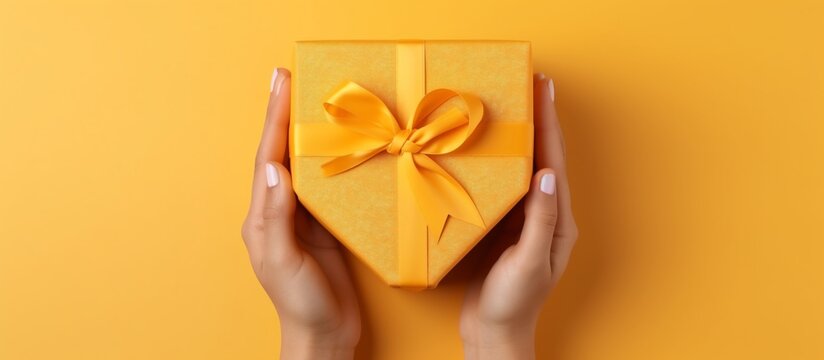 Hands holding a beautifully wrapped yellow gift box with a ribbon against a bright background
