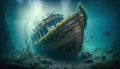 ship wreck in the sea. Pirate boat under the ocean. Decaying remains with coral reefs and masts.