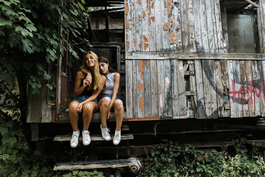Women embracing in wrecked cabin