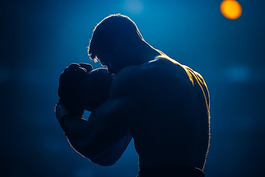 A silhouette of a victorious wrestler or fighter celebrating with arms raised and fingers pointing up.