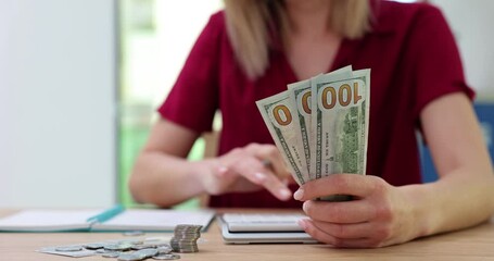 Woman holds dollars and counts expenses on calculator and writes in notepad
