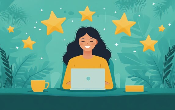 Satisfied customer writing a glowing online review, praising product benefits, bright and positive feedback, digital platform, consumer approval, product excellence