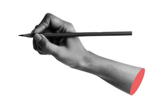 Trendy hand holding a pencil, abstract cutout hand halftone collage element for design montage