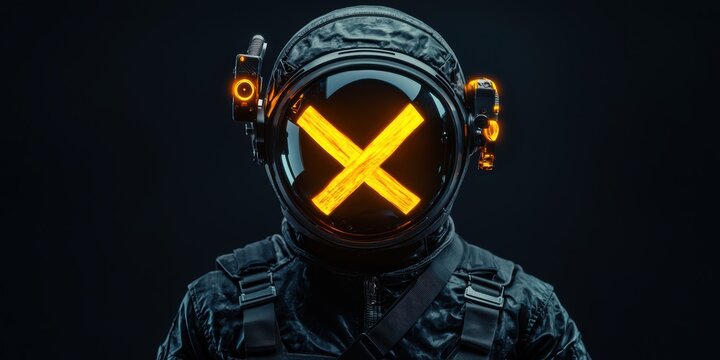 Dark astronaut with yellow xs over eyes futuristic space exploration digital art sci-fi environment front view conceptual imagery