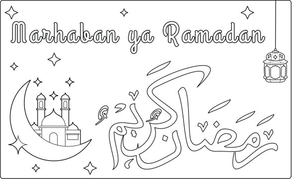 Coloring Book Marhaban ya Ramadan coloring page with mosque, crescent moon, lantern and Arabic calligraphy design
