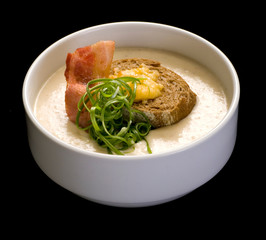Soup puree, cream soup yellow with ham and croutons, dry bread. close up