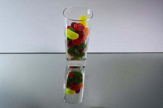 Multicolored tasty candies in a glass cup on the mirror. The reflection of the glass and sweets creates a striking effect of volume and increases the number of objects in the frame, which makes sweets