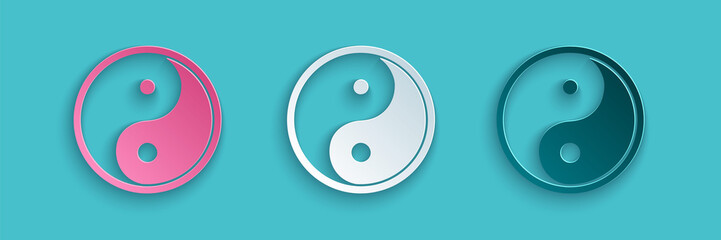 Paper cut Yin Yang symbol of harmony and balance icon isolated on blue background. Paper art style. Vector Illustration