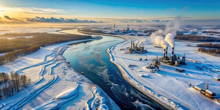 Aerial View Of A Frozen River Flowing Through A Snowy Landscape With Oil Rigs In The Distance, Capturing The Industrial Development Of Yanao, Russia.