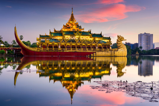 Futuristic aerial view panorama of developing Yangon city , Aerial view of Sule pagoda in downtown, Yangon, Myanmar. Sule Pagoda located in the heart of Yangon, Karaweik royal barge, Kandawgyi Lake,