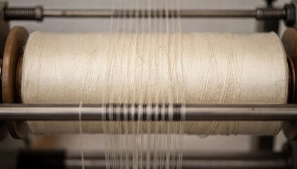 multi-colored threads for sewing in the form of a rainbow pass through an antique needle on a white background