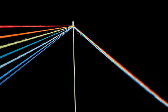 multi-colored threads for sewing in the form of a rainbow pass through an antique needle on a black background