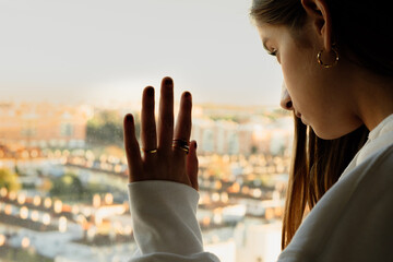 Portrait of teenager girl looking trough window