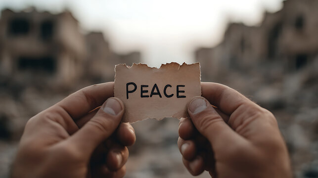 Holding 'Peace' in Ruins: A symbol of hope and resilience amidst destruction, calling for harmony in a world yearning for tranquility and stability.
