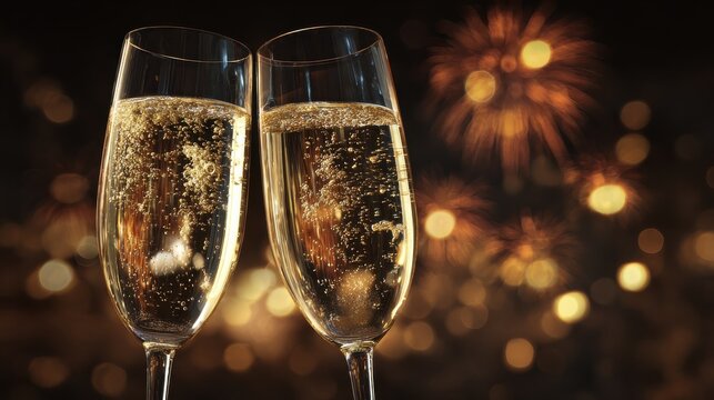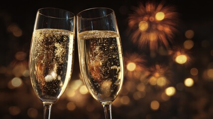 two champagne glasses with sparkling bubbles festive decor and a glowing background of fireworks perfect for celebration holiday or new years eve themes