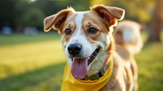 A happy dog wearing a yellow bandana, playing in the grass, symbolizing playful cheer and energy