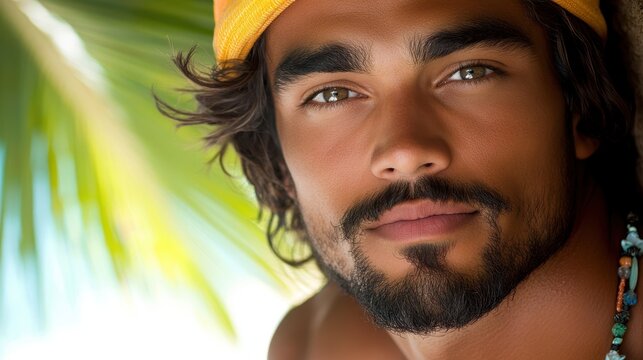 A woman with a yellow bandana on her head is smiling