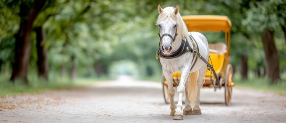 A white horse pulls a yellow buggy down a dirt path through a woods dense with trees