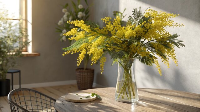 A beautiful bouquet of mimosa flowers in an elegant vase sits on a table, displaying a vibrant yellow color scheme and shadows