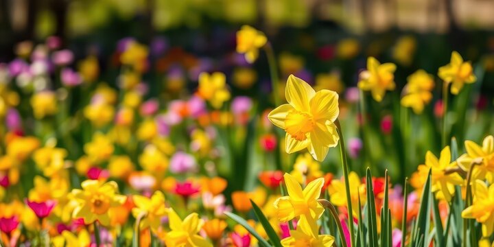 Vibrant yellow daffodil flowers blooming in a lush field under the bright sun, field, spring, bright