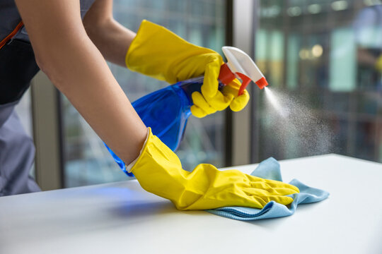 Young woman in yellow gloves cleaning the table in the office