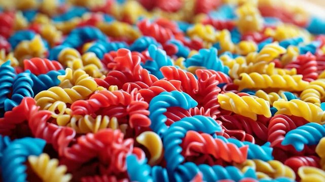Close-up of colorful twisted fusilli pasta in vibrant red blue and yellow hues showcasing a dynamic spread against a softly lit blurred background highlighting texture and variety