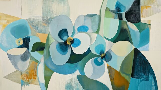 Abstract floral painting featuring blue green and yellow hues on a white background.