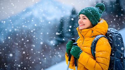 Happy smiling woman in yellow jacket and green hat with a backpack and hiking poles enjoying a winter hike in the mountains. Active lifestyle. Copy space.