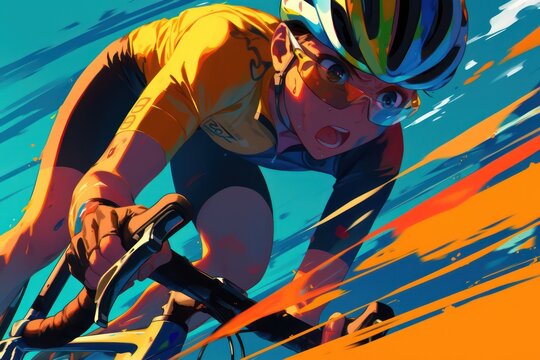 Illustration of a female cyclist in a yellow jersey raising her arms in victory. This image was created using AI generative technology.