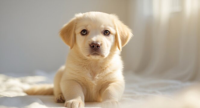 Friendly yellow lab puppy sitting calmly indoors