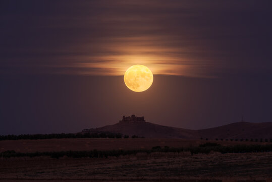 Bright yellow moon glowing on night sky over distant castle and fields in countryside