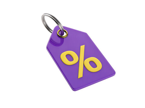 Purple discount tag with yellow percentage symbol isolated on transparent background