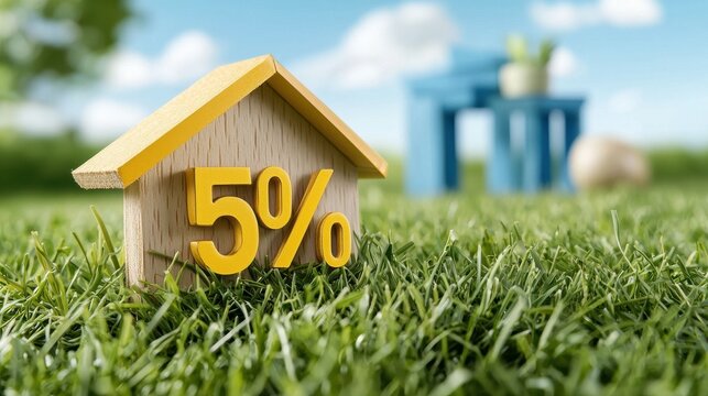 A wooden house model on green grass with a yellow percentage symbol emphasizing interest rates, representing real estate and financial growth.