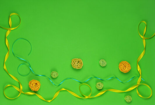 A border with wavy green and yellow ribbons and rattan balls on lime background. Top view, flat lay. Free copy space