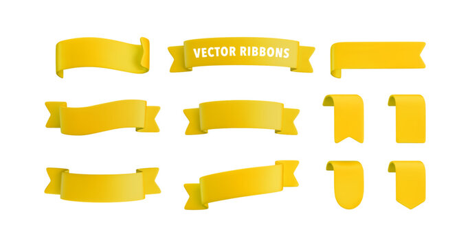 Vector Realistic 3d Ribbons and tags set. Cartoon 3d yellow ribbons collection on white background. Vintage design element, decorative sticker. Cute folded ribbon for sale banner, advert, game, app.
