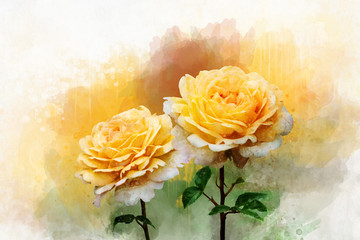 Yellow rose garden background with watercolor