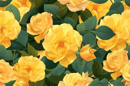 Elegant yellow roses bloom softly on a dark blue background creating a vintage floral pattern. AI Generated