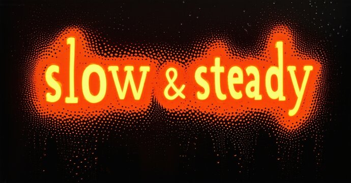 Bright yellow text reads slow steady against dark background. Dots create glowing effect around words. Simple, bold design.