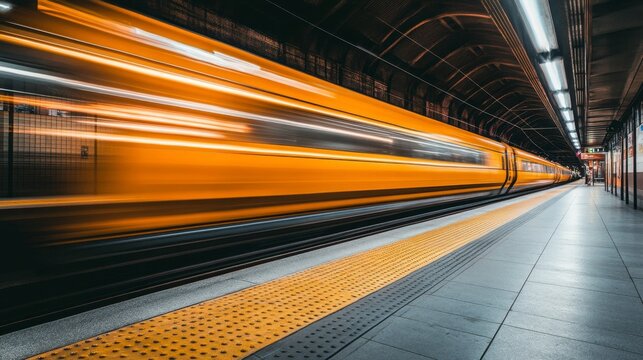 Blurred motion of a yellow train speeding through a dark urban train station at night. The platform is visible with yellow lines, and the train is a bright yellow blur.