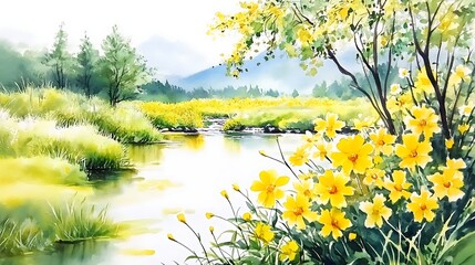 Serene Landscape Watercolor Painting Peaceful River Scene with Yellow Wildflowers and Trees in Green Field Mountain Background Artistic Nature Scenery