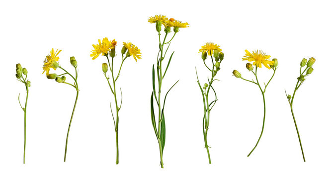 Botanical Collection. Set of yellow wildflowers Crepis tectorum isolated on white background. Elements for creating designs, cards, patterns, floral arrangements, frames, wedding cards and invitations