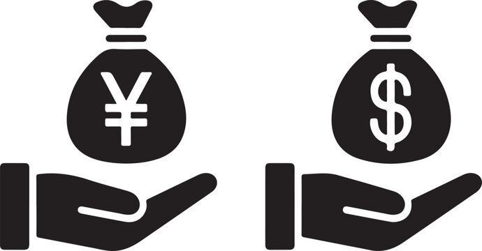 Hand holding money bag with yen symbol and hand holding money bag with dollar symbol