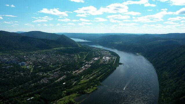 Flying drone along wide river and mountains, hydroelectric power plant in background. Height of bird's flight. Aerial view of beautiful drone shot of Divnogorsk city near Yenisei river.