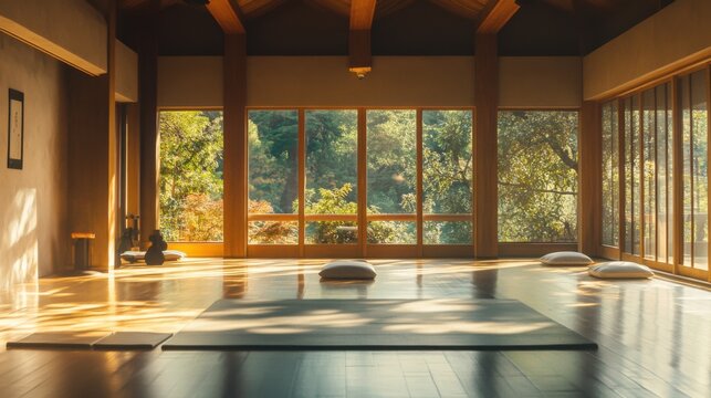 A tranquil yoga studio with soft lighting, calming music, and minimalist decor, offering a peaceful space for relaxation and meditation.