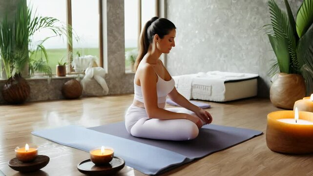 Peaceful woman in yoga pose promoting wellness serenity focus