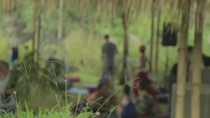 Woman giving meditation course to two multi-ethnic men on yoga mats in traditional temple in Bali Indonesia