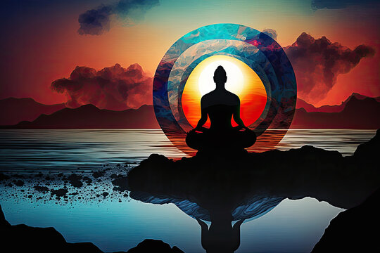 abstract picture of a yogi sitting in a lotus position facing the sunset at the water's edge and the outlines of mountains on the horizon