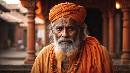 mystical hindu yogi man, temple in india, spiritual culture, traditional orange clothing, portrait