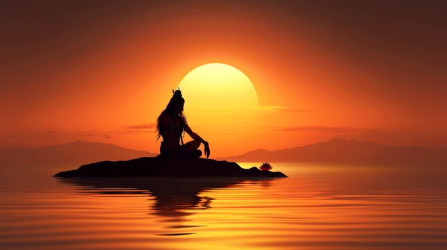 Silhouette of a meditating yogi on a rock with a lotus flower in a lake during a colorful sunset